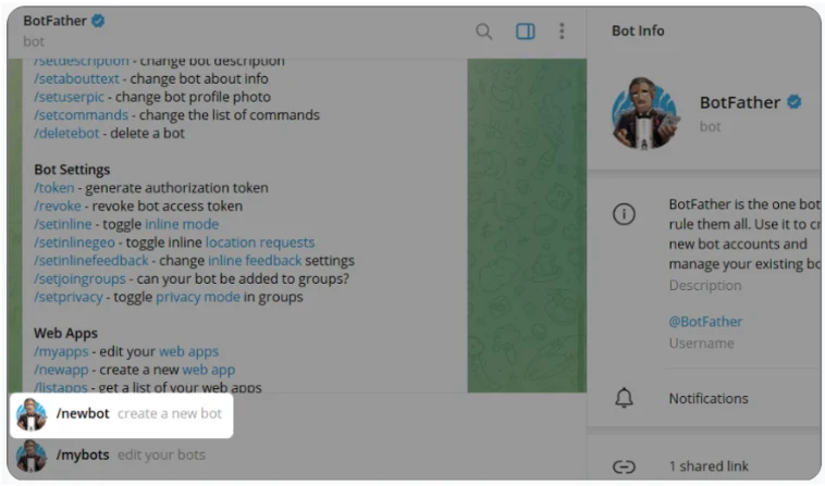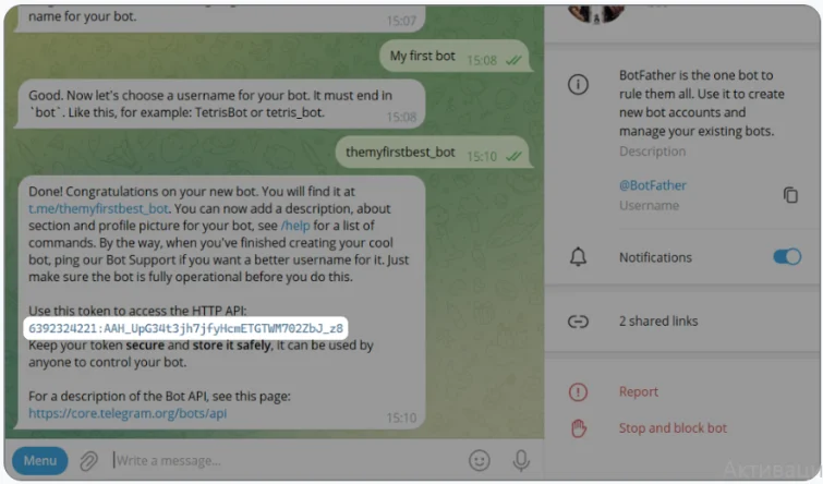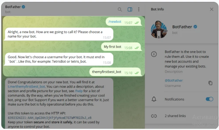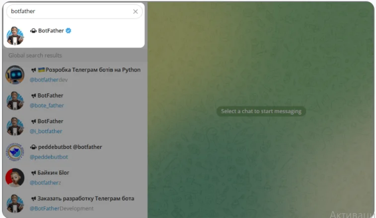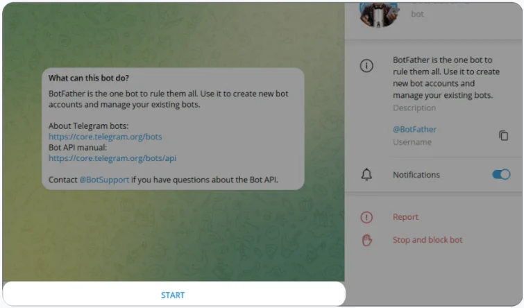 • Нажмите Start, чтобы начать диалог с @Botfather.